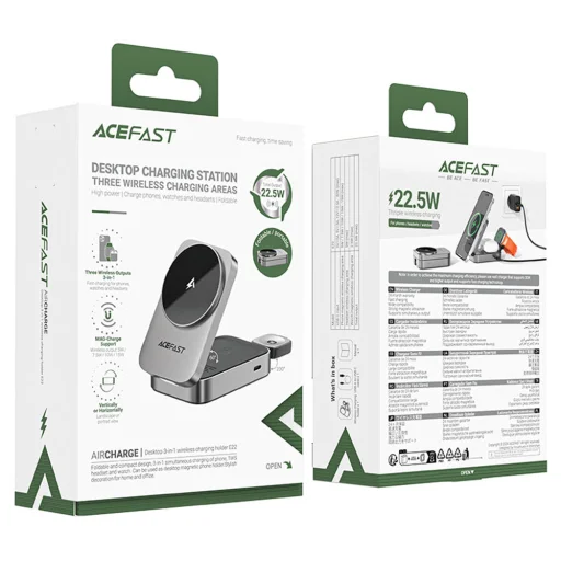 Rendszerezze és töltse eszközeit stílusosan az Acefast Töltőállomás 3 az 1-ben (E22) segítségével! Ez az innovatív, fém szürke színű, összecsukható töltőállomás ideális megoldást kínál arra, hogy egyszerre tartsa feltöltve okostelefonját, vezeték nélküli fülhallgatóját és Apple Watch-át, miközben minimalizálja a kábelek okozta rendetlenséget otthonában vagy irodájában. Elegáns kialakítása és praktikus funkciói révén a modern élet elengedhetetlen kiegészítője.