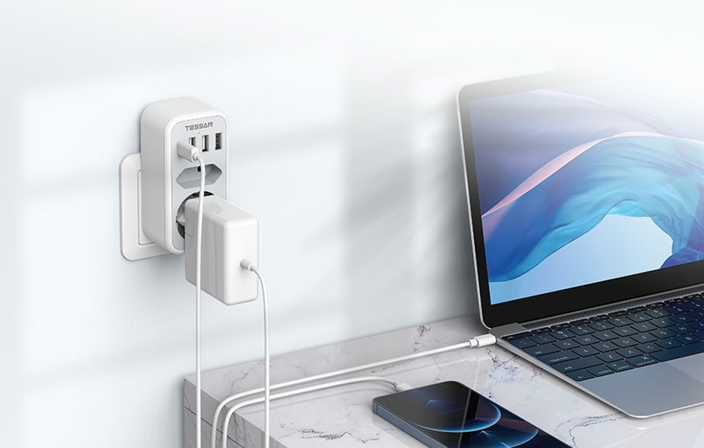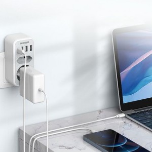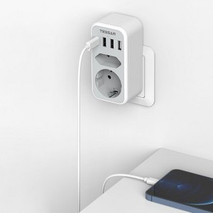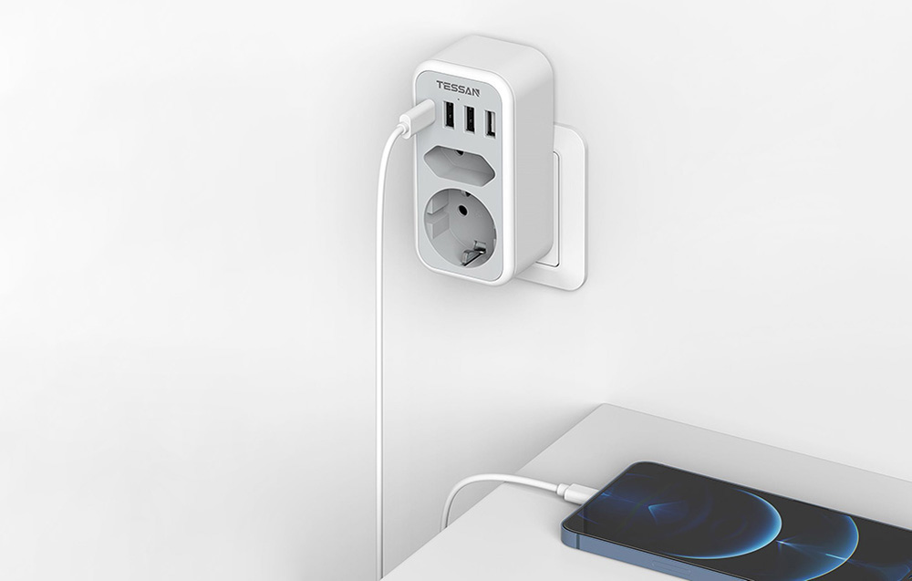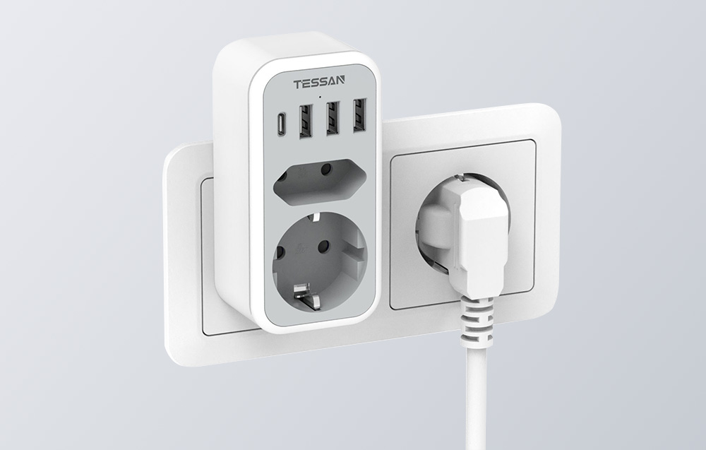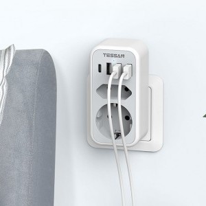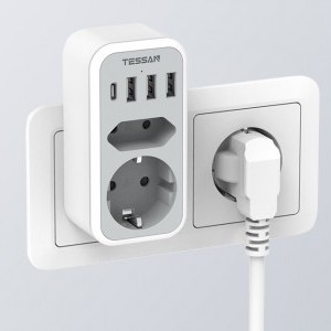 A Tessan TS-328 fali aljzat segít helyet megtakarítani és elősegíti a megfelelő térszervezést. Egy európai aljzattal, egy földelt aljzattal, 3 USB-A és egy USB-C porttal van felszerelve, lehetővé téve, hogy akár 6 eszközt is egyszerre láss el árammal vagy tölts fel. Maximális terhelése 16 A. A termék biztonságos használatot biztosít és kompakt méretekkel rendelkezik (5,4 x 10,7 x 4 cm), ami kiválóan alkalmassá teszi utazáshoz is.