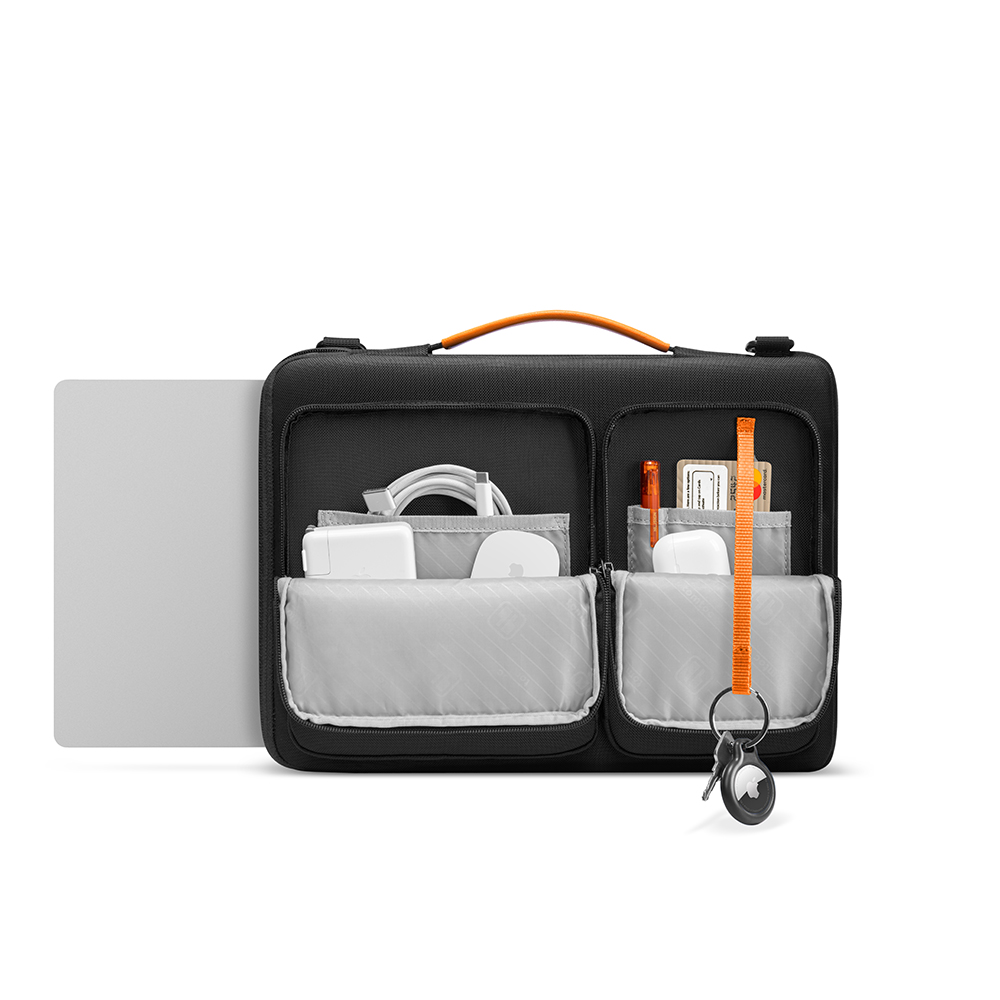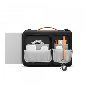 A modern és letisztult fekete dizájn, kiegészítve a jellegzetes narancssárga részletekkel (fogantyú, Tomtoc logó, kulcstartó pánt), eleganciát kölcsönöz a táskának. A kiváló minőségű anyagok és a precíz kidolgozás garantálja a hosszú élettartamot és a mindennapi használattal szembeni ellenállást.