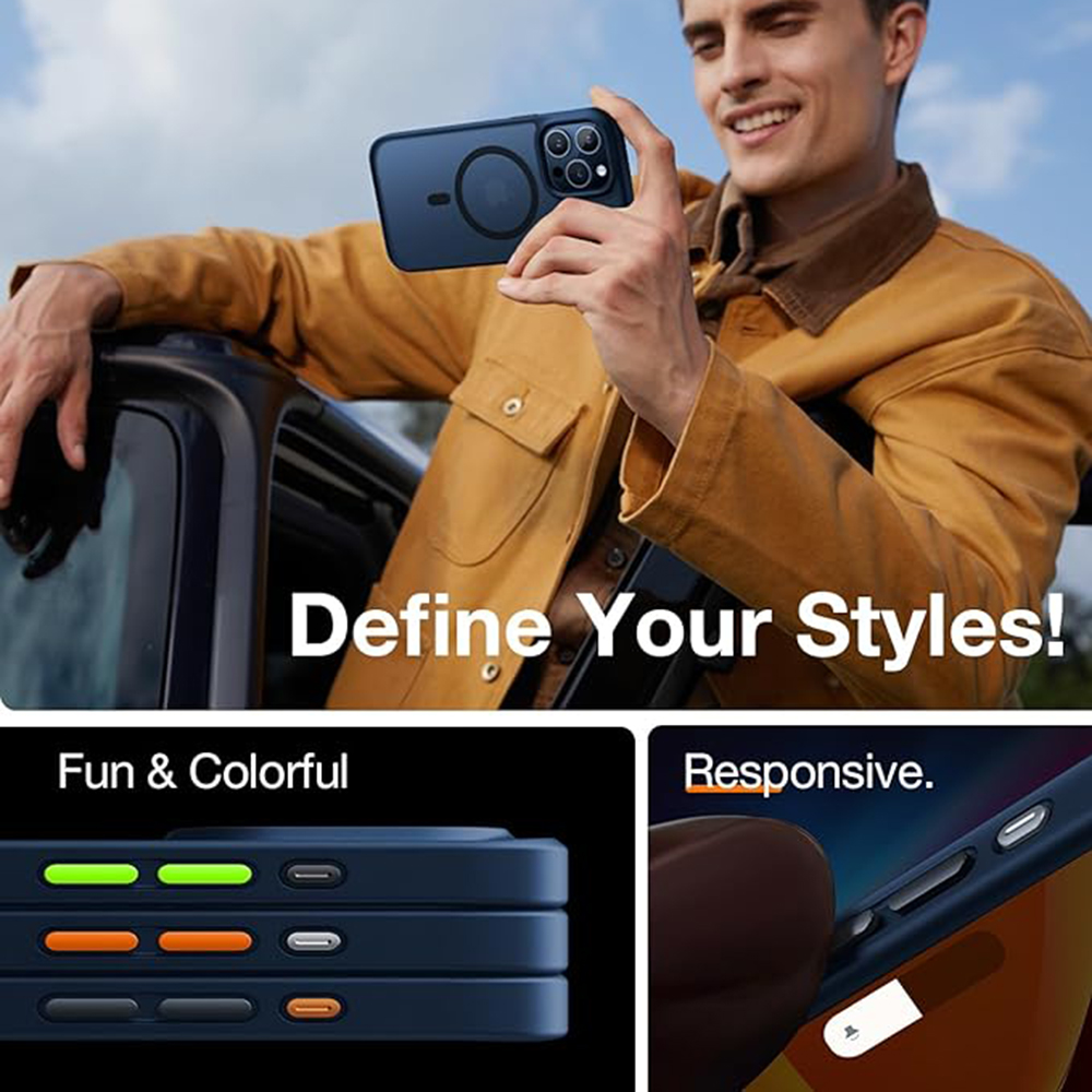 A tengerészkék színű tok elegáns és modern megjelenést kölcsönöz iPhone 15 Pro Max készülékének, miközben az áttetsző hátlap engedi érvényesülni a telefon eredeti szépségét. A „Define Your Styles!” (Határozza meg stílusát!) szlogen jegyében a tok lehetőséget kínál a személyre szabásra a cserélhető, élénk színű gombokkal (zöld, narancs, szürke), amelyek kiváló, reszponzív tapintási visszajelzést biztosítanak. A letisztult design és a prémium anyaghasználat garantálja a kényelmes fogást és a tartós használatot, miközben Ön is kifejezheti egyéniségét.