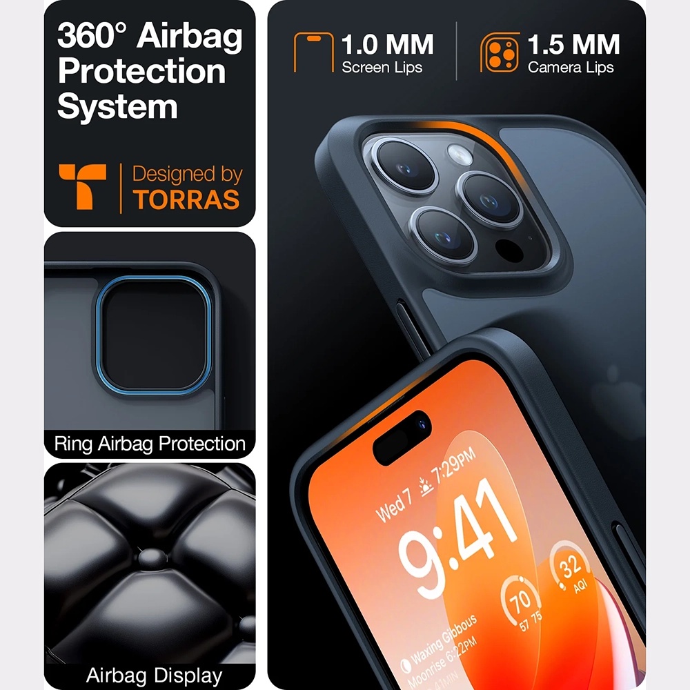 - 360°-os légpárnás védelmi rendszer: A Torras által tervezett átfogó védelmi rendszer magában foglalja a kamera körüli gyűrűs légzsákos védelmet és a stratégiai pontokon elhelyezett légpárnákat a kijelző és a hátlap sérüléseinek megakadályozására.