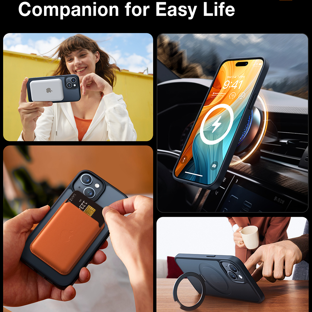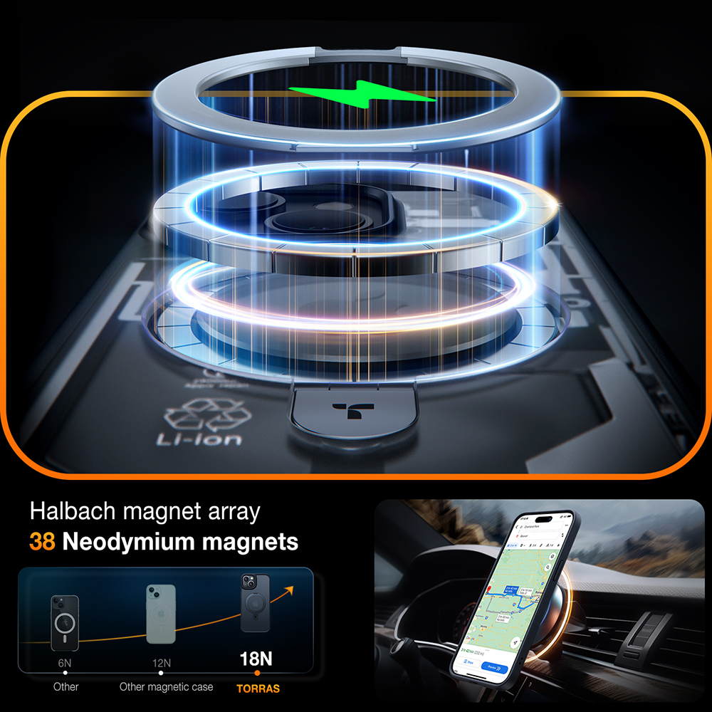- Halbach mágneses tömb: A tok 38 neodímium mágnest tartalmazó Halbach mágneses tömbbel van felszerelve, amely kivételesen erős, 18N-es mágneses vonóerőt biztosít. Ez jelentősen felülmúlja a hagyományos mágneses tokokat (6N-12N), garantálva a MagSafe kiegészítők, például pénztárcák vagy autós tartók biztonságos és stabil rögzítését.