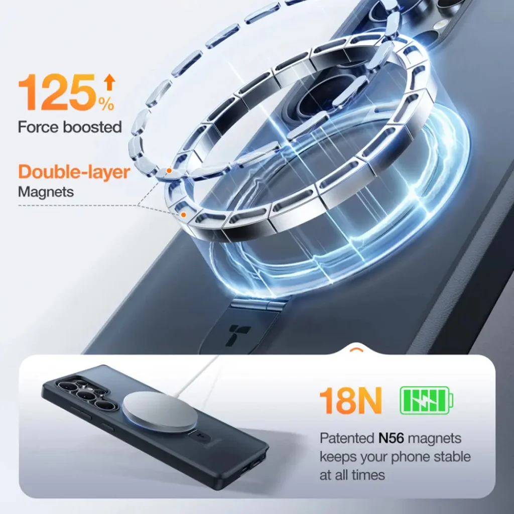 • 125%-kal megnövelt mágneses erő: A dupla rétegű, szabadalmaztatott N56 mágnesek 18N-es húzóerőt biztosítanak, ami kivételesen erős és stabil kapcsolatot garantál a MagSafe-kompatibilis tartozékokkal.