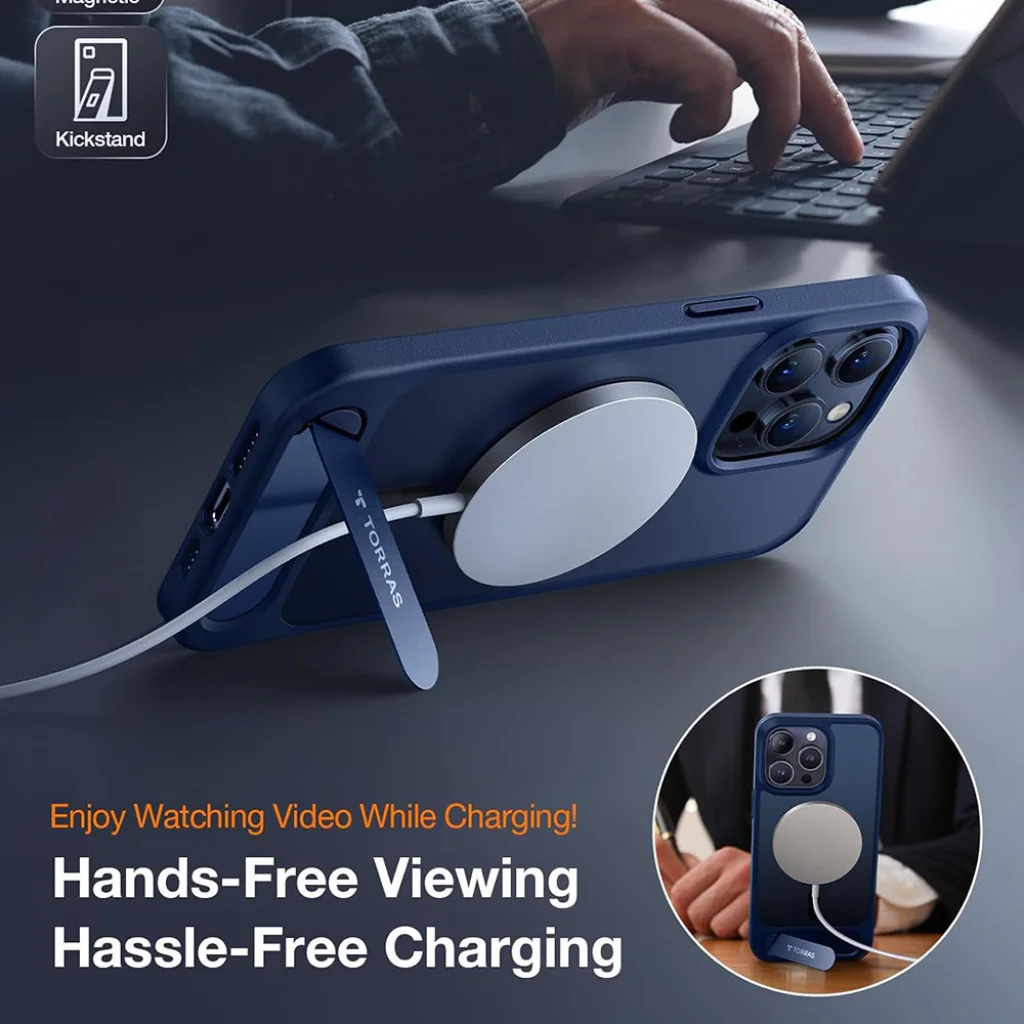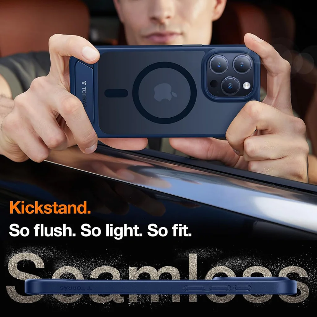 A Torras Pstand sötétkék tok kifejezetten az iPhone 15 Pro Max készülékhez készült, hogy ötvözze a stílust, a funkcionalitást és a páratlan védelmet. Ez a prémium minőségű tok a beépített, rejtett állvánnyal és az erős MagSafe kompatibilitással emeli telefonhasználati élményedet egy új szintre.