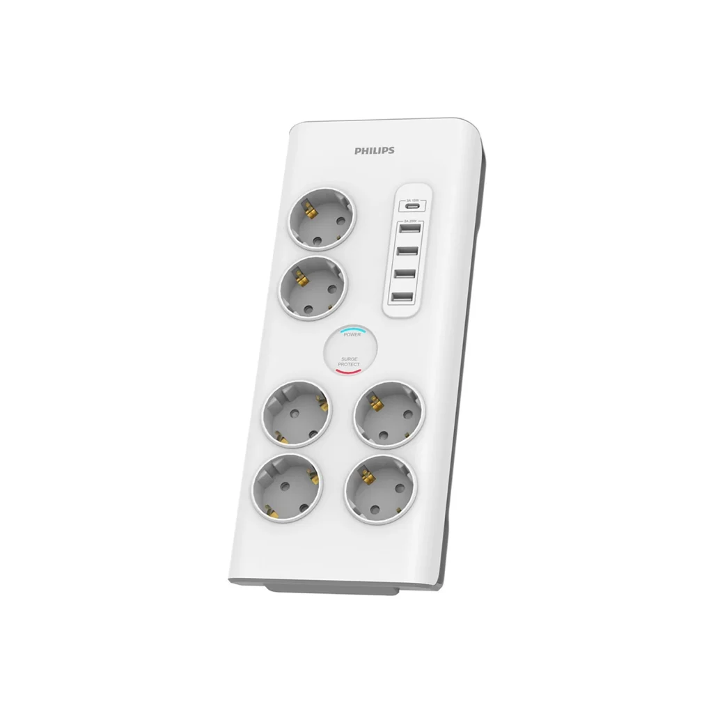 PHILIPS Túlfeszültségvédő Elosztó – 6 Schuko Aljzat + 4x USB-A + 1x USB-C, 2m, 16A, Fehér