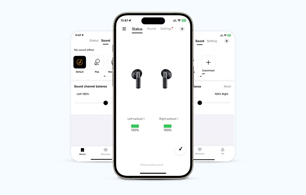 A fejlett 360°-os surround hangzás algoritmusnak köszönhetően úgy érezheti magát, mintha egy koncert vagy mozi közepén lenne. A térbeli hanghatás valósághű hangszínpadot hoz létre, amely minden oldalról körülveszi Önt a páratlanul magával ragadó élmény érdekében. Emellett a fejhallgató hangzását a dedikált QCY alkalmazás segítségével kedvenc zenei műfajaihoz igazíthatja. A beépített EQ-beállításokkal, mint például a Rock, a Klasszikus és a Bass Boosted, tökéletesen az Ön preferenciáira szabott hangzást élvezheti. Az alkalmazás a fejhallgató töltöttségi szintjének felügyeletét, a készülék helyének meghatározását, érintésvezérlést, üzemmódváltást és szoftverfrissítéseket is kínál.