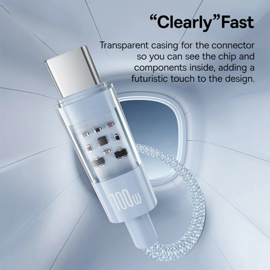 - Átlátszó csatlakozóház: A futurisztikus megjelenésű, átlátszó csatlakozóház nemcsak egyedi és modern esztétikai élményt nyújt, hanem lehetővé teszi, hogy belessen a kábel "szívébe", megcsodálva a beépített chipet és alkatrészeket. Ez a "Clearly" Fast design hangsúlyozza a belső technológia fejlettségét.