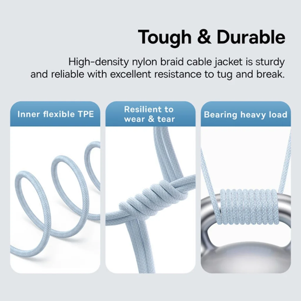 - Nagy sűrűségű fonott kábelköpeny: A strapabíró, nagy sűrűségű nylon fonott külső burkolat (High-density braid jacket) kiváló ellenállást biztosít a húzásnak, csavarodásnak, kopásnak és a törésnek, jelentősen meghosszabbítva a kábel élettartamát.