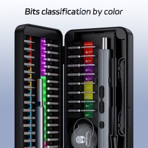 A fejek szín szerint vannak osztályozva, ami megkönnyíti a rendszerezésüket és gyorsan megtalálni a megfelelő eszközt. A készlet S2 acélból készült fejeket tartalmaz, és a csavarhúzón beépített mágneses jellemző található, a még nagyobb pontosság és kényelem érdekében.