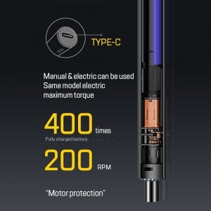 Ideális mobiltelefonok, játékkonzolok, szemüvegek, háztartási készülékek, számítógépek és órák javítására. Teljesen feltöltött akkumulátorral 400 működési ciklusig bírja, és a sebessége 200 fordulat/perc.