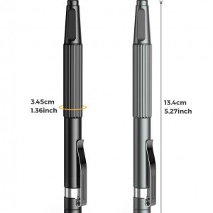 Professzionális 13 az 1-ben hordozható csavarhúzó toll formában. Ideális szemüvegek, órák, hordozható ventilátorok, számítógépek és más elektronikus eszközök javítására. Mindig kéznél lehet - ultra könnyű és kompakt. Kompakt és könnyű Szinte bárhová magaddal viheted - a beépített klipsz lehetővé teszi, hogy a csavarhúzót a zsebedhez vagy jegyzetfüzetedhez csíptesd. Tökéletes eszköz a kis, mindennapi javításokhoz. Különféle hegyek A készlet több hegyet tartalmaz, mint más hasonló termékek, ami növeli a sokoldalúságát. A hegyek tárolása a tokon belül megkönnyíti a rendszerezést és a hozzáférést. Kényelmes Ergonomikus kialakítás és csúszásmentes felület biztosítja a kényelmes használatot és energiamegtakarítást munka közben. Masszív kialakítás Tartós alumínium ötvözetből készült, amely ellenáll a deformációnak és hosszú élettartamot biztosít. Specifikáció: Méretek: Magasság: 13,4 cm Kerület: 3,45 cm