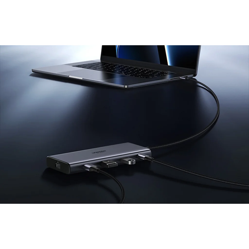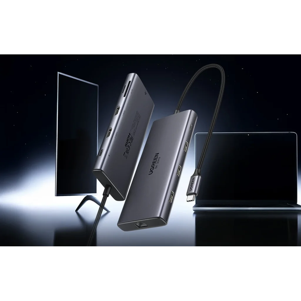 Az Ugreen CM639 egy 10 az 1-ben USB-C hub, amelyet a laptop egyetlen USB-C portjához csatlakoztatva tíz további portot nyerhetsz az adatok, a videó és a tápellátás számára. Két, akár 8K felbontást támogató HDMI-kimenettel, három USB-A porttal, egy USB-C porttal adatátvitellel, SD- és TF-kártyaolvasóval, 1 Gbps-os Ethernet-porttal és 100 W-os PD-vel rendelkezik. A készülék támogatja az egyidejű töltést, adatátvitelt és a két képernyős működést 4K vagy 8K minőségben, így sokoldalú eszköz az irodai és a távoli munkavégzéshez egyaránt.