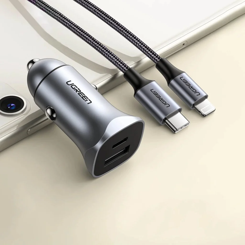 Ugreen gyors autós töltő USB-A / USB-C 30W PD PPS szürke (CD130) A töltőhöz való hozzáférés az autóban fontos, függetlenül az út hosszától. Ezzel a kétportos Ugreen eszközzel kényelmesen tölthetsz egyszerre két eszközt is. Használata nagyon egyszerű - csak be kell dugni a szivargyújtó aljzatába. Ezt egy kézzel is megteheted, és élvezheted az elektronikus eszközeid töltésének lehetőségét. Műszaki adatok: