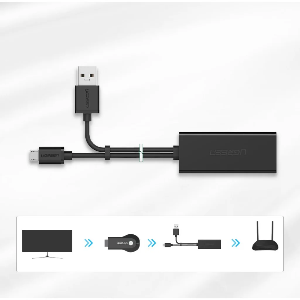 - Lehetővé teszi a Micro USB aljzatú TV stick, Chromecast Ultra / 3 / 2 / 1 / Audio, Google Home Mini, Raspberry Pi Zero, stb. vezetékes internet csatlakozását