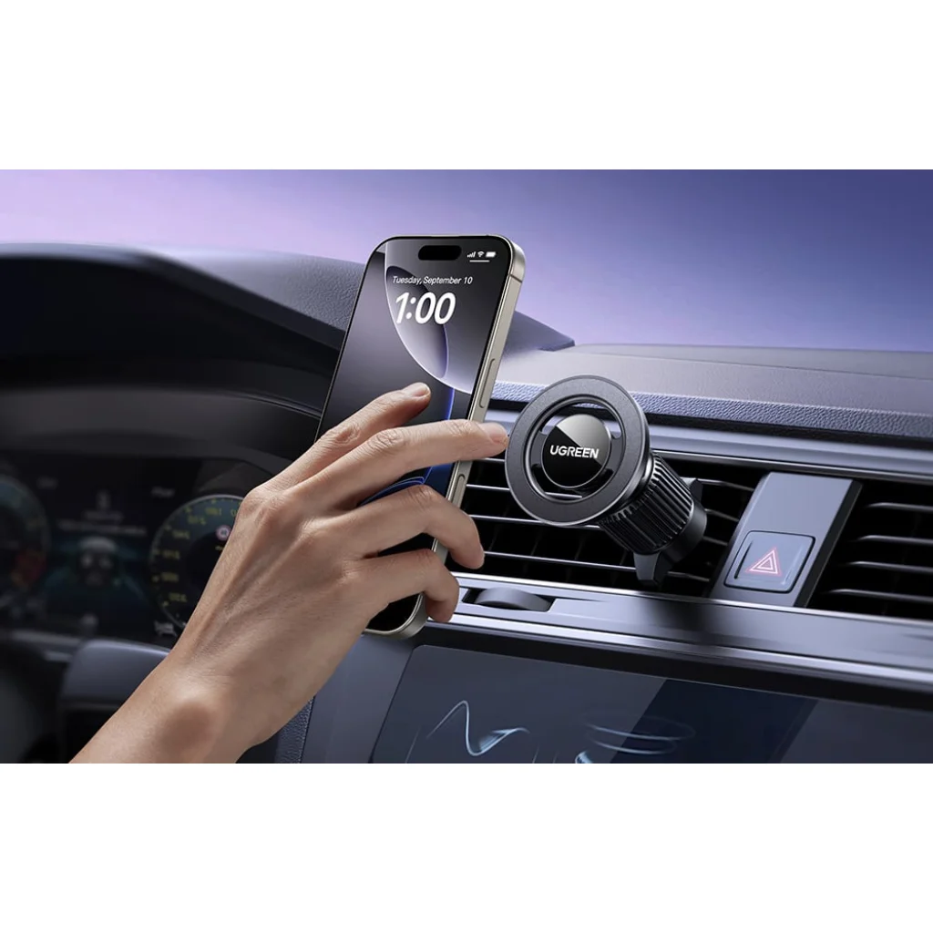 Az UGREEN LP986 egy masszív autós tartó, amely kényelmet és biztonságot nyújt vezetés közben - akár a szellőzőnyílásra, akár a műszerfalra szerelhető. Erős mágnesének és állítható fejének köszönhetően a tartó lehetővé teszi, hogy gyorsan rögzítse telefonját, és a képernyőt a tökéletes szögben pozícionálja. Ez a MagSafe rendszerrel rendelkező iPhone-felhasználók számára praktikus megoldás, de Androiddal is sikeresen működik - csak használd a mellékelt mágneses gyűrűt.