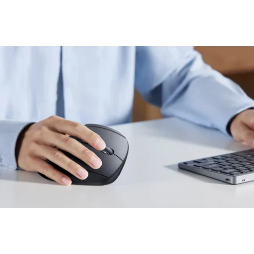 Ergonómikus függőleges kialakítás: Az egér függőleges formájú, így a kéz természetesebb pozícióban pihenhet, mint a hagyományos egereknél. Ez a megoldás segít csökkenteni a csukló terhelését és a kéz fáradását a számítógép hosszú ideig tartó használata során. A kontúrozott forma stabil fogást és kényelmes használatot biztosít, különösen közepes vagy nagy méretű kezekkel rendelkezők számára.