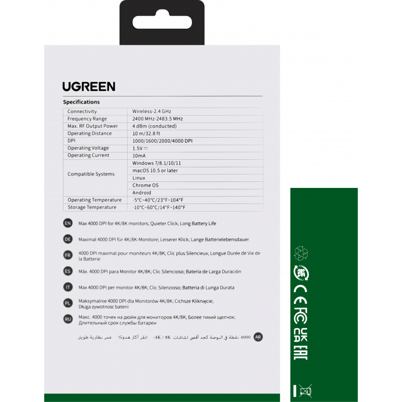 A UGREEN MU001 vezeték nélküli egér kényelmes és precíz élményt nyújt, így ideális mind a munkához, mind a szórakozáshoz. Ergonomikus kialakítása és optikai érzékelője 4 DPI szinttel (1000/1600/2000/4000) biztosítja a magas kurzor-pontosságot. A vezeték nélküli hatótávolsága akár 15 méter is lehet, és USB vevőegységgel csatlakozik 2,4 GHz-es frekvencián, a legtöbb felületen, beleértve az asztalokat is, működik. A gombok élettartama körülbelül 3 millió kattintás, és DPI gombbal rendelkezik az érzékenység beállításához. Egy darab AA elemmel működik (nem tartozék), és kompatibilis a Windows 11/10/8/7, macOS, ChromeOS és Linux operációs rendszerekkel, így praktikus és tartós megoldást kínál a napi tevékenységeik során kényelmet és teljesítményt kereső felhasználók számára.