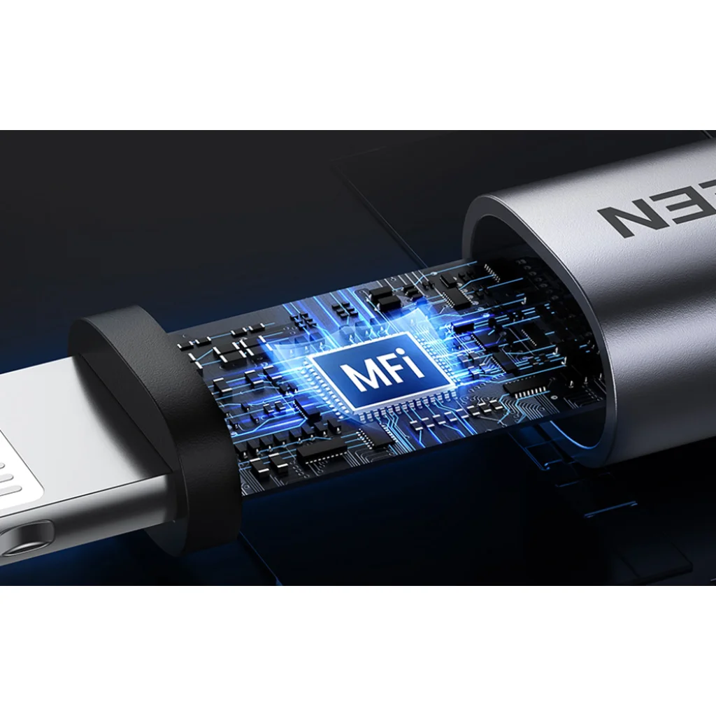 Az eredeti C94 Lightning csatlakozó biztosítja a megfelelő szintű tápellátást – ez a felelős a PD 20 W-os gyorstöltési protokollok támogatásáért. Mindössze 30 perc elegendő ahhoz, hogy az iPhone akkumulátorát 60%-ra töltse fel! A kábelt chippel is ellátták, melynek eredetiségét az MFi tanúsítvány igazolja – biztos lehet benne, hogy a feltöltött készülékek teljes biztonságban vannak.