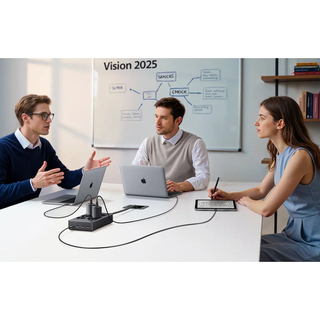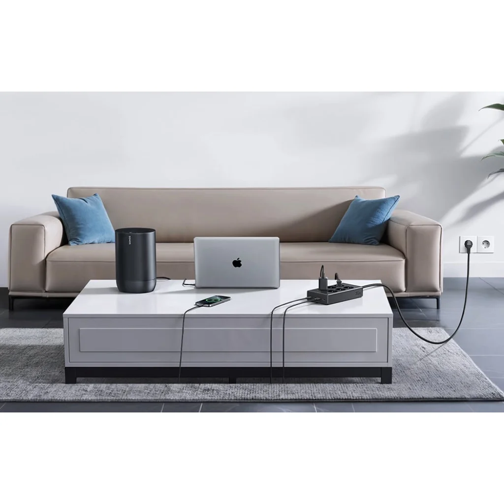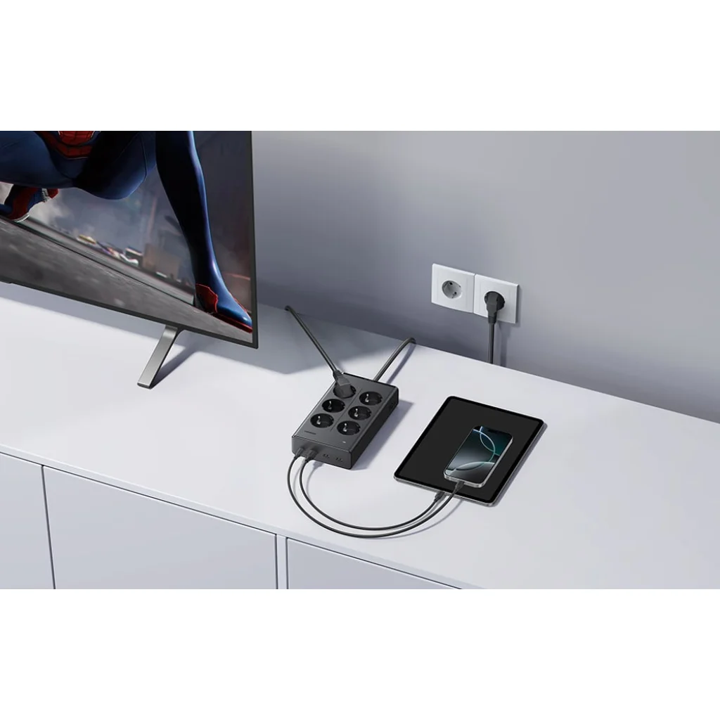 GaN technológia és a berendezések védelme: A hálózati elosztót GaN (gallium-nitrid) technológiával tervezték, ami lehetővé tette a készülék méretének csökkentését anélkül, hogy a teljesítmény és a hatékonyság csökkenne. Ezáltal az elosztó könnyebb, hatékonyabb és kevesebb hőt termel. A beépített túlfeszültség-védők megvédik a csatlakoztatott berendezéseket a feszültségcsúcsoktól, a túltöltéstől és a rövidzárlatoktól.