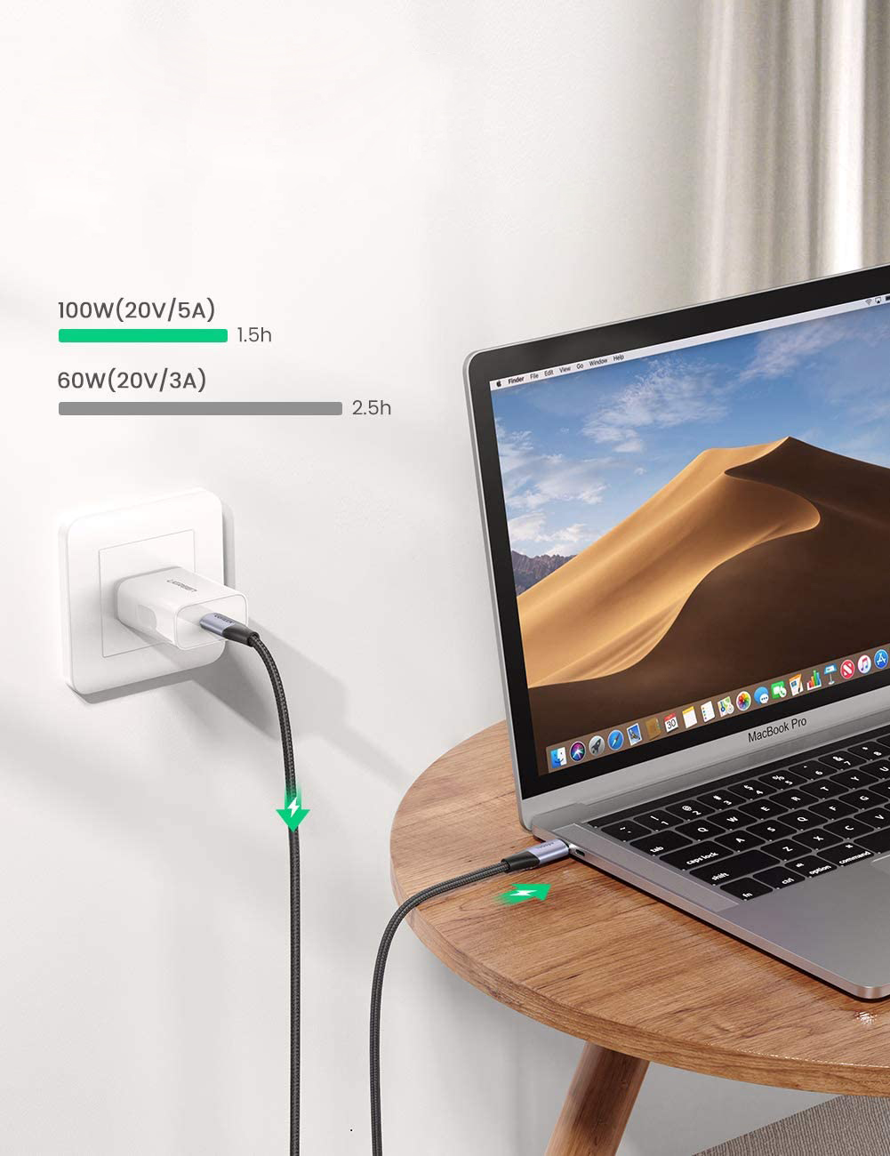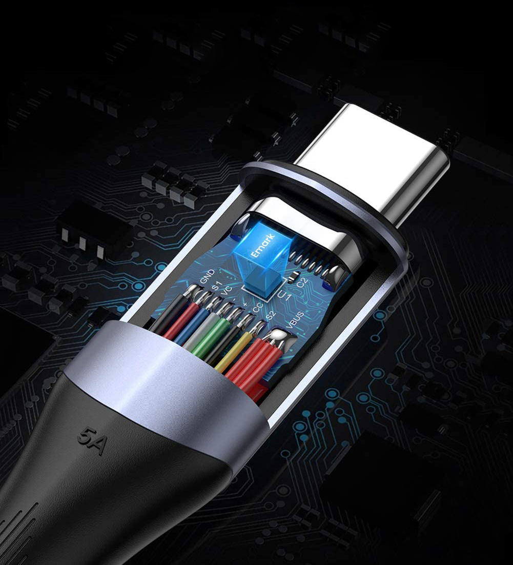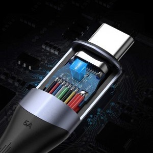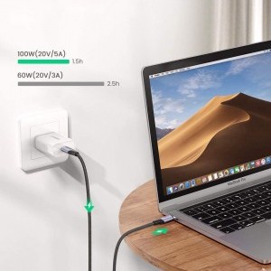 A kábel gyorsabb és stabilabb töltést és adatátvitelt biztosít. Támogatja a gyorstöltést 100 W-tal, 20 V-tal és 5 A-rel.