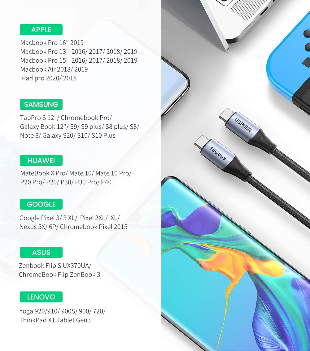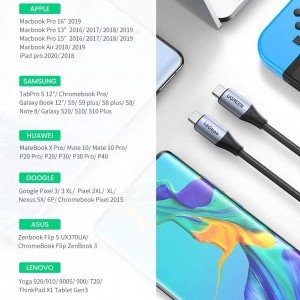 A kábel kompatibilis minden olyan eszközzel, amely rendelkezik C típusú USB bemenettel. Olyan eszközöket támogat, mint az Apple Macbook Pro, a Dell XPS, a Huawei Matebook és még sok más.