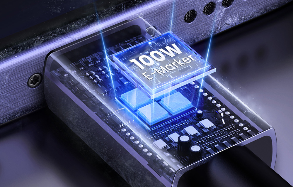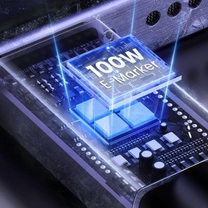 A kábel fejlett E-Marker chippel van felszerelve, amely automatikusan felismeri a csatlakoztatott eszközt, és beállítja a töltési teljesítményt. Ez biztosítja a biztonságos és hatékony töltést, és megvédi eszközeit a túltöltéstől és a túlmelegedéstől.