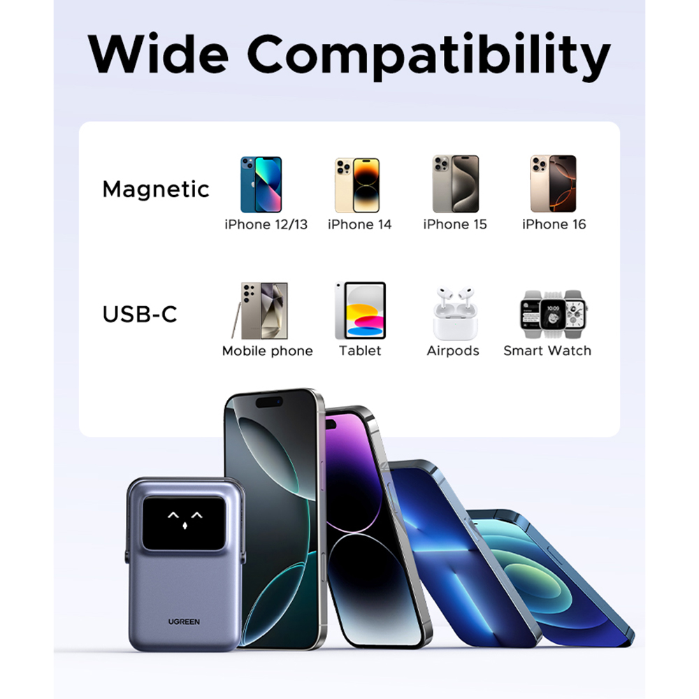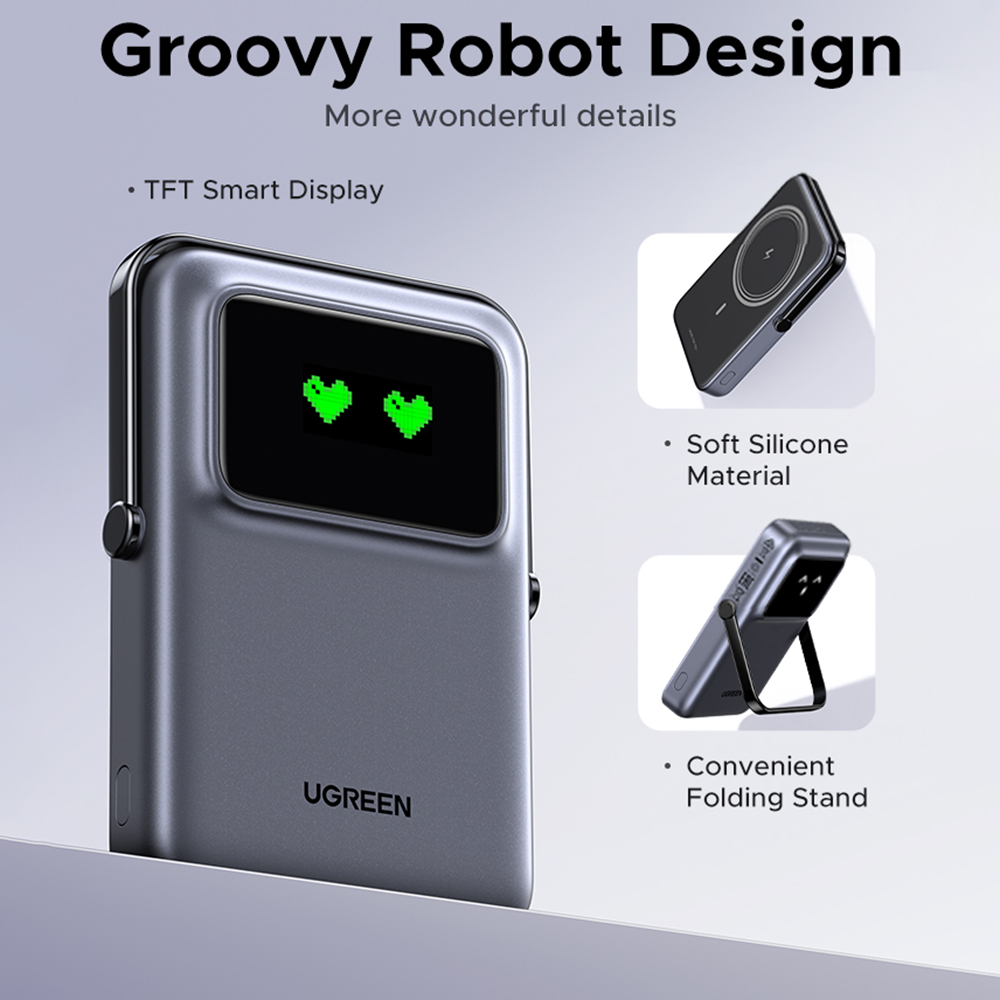 Fedezze fel az Ugreen Uno PB572 vezeték nélküli power bankot, amely a MagSafe technológia, a gyors töltés és a stílusos design tökéletes kombinációja. Ez a szürke színű, 10000 mAh kapacitású power bank nem csak energiát biztosít eszközeinek, de egyedülálló TFT kijelzőjével és beépített állványával is kiemelkedik a piacon.