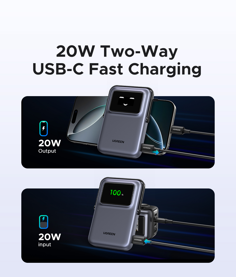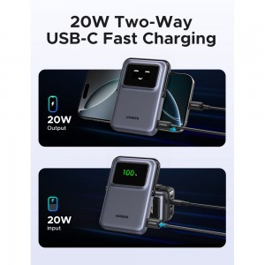 - 20W kétirányú USB-C gyors töltés: Villámgyorsan töltheti készülékeit (akár 20W kimenettel) és maga a power bank is gyorsan feltölthető (20W bemenettel) az USB-C porton keresztül.