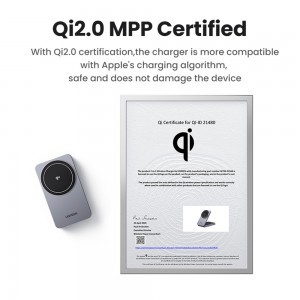 - Jellemzők: Qi2 Certified, MagSafe kompatibilis, MPP, FOD Detection (Idegen Tárgy Érzékelés), N52H Magnets, összecsukható, állítható (70°), súlyozott alap, horizontális és vertikális töltés támogatása