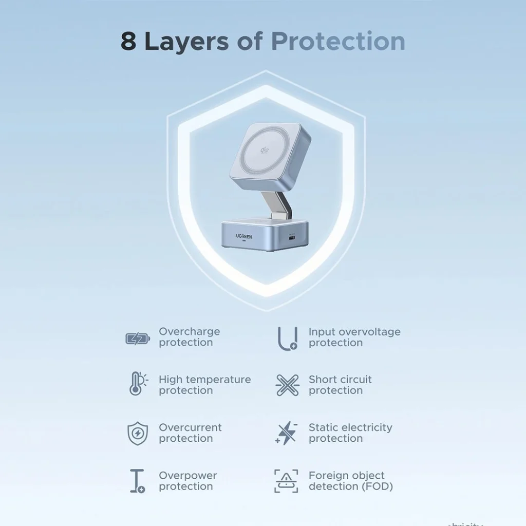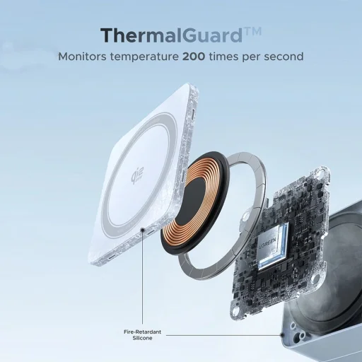 - Intelligens hőmérséklet- és biztonsági védelem (ThermalGuard™): A ThermalGuard™ technológia másodpercenként 200 alkalommal ellenőrzi a hőmérsékletet. A 8 rétegű beépített védelem magában foglalja a túltöltés, bemeneti túlfeszültség, túlmelegedés, rövidzárlat, túláram, statikus elektromosság, túlteljesítmény elleni védelmet, valamint az idegen tárgyak észlelését (FOD) a biztonságos töltés érdekében. Tűzálló szilikon alkatrészek biztosítják a tartósságot és a biztonságot.