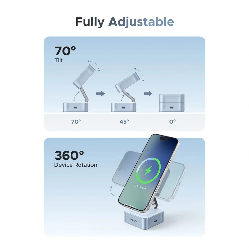 Kompakt, összecsukható kialakításának és állítható dőlésszögének köszönhetően ideális otthoni, irodai vagy utazási használatra. A beépített USB-C kimeneti port (USB-C2(OUT)) további eszközök, például okosórák kényelmes töltésére is lehetőséget ad, így valóban sokoldalú társad lesz a mindennapokban.