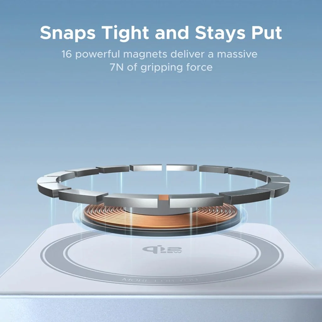 - Erős mágneses rögzítés: 16 nagy teljesítményű mágnessel felszerelve, amelyek 7N tartóerőt biztosítanak, garantálva a biztonságos illeszkedést és a hatékony töltést minden alkalommal.