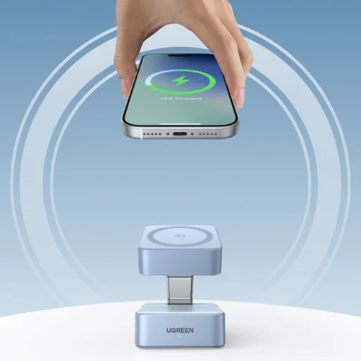 - Két eszköz egyidejű töltése: Töltsd MagSafe-kompatibilis telefonodat és egy második eszközt (például fülhallgatót vagy egyéb Qi-kompatibilis kiegészítőt) egyszerre. Az UGREEN W752 egy további USB-C kimeneti porttal (USB-C2(OUT)) is rendelkezik, amellyel egy harmadik eszközt is tölthetsz kábelen keresztül.