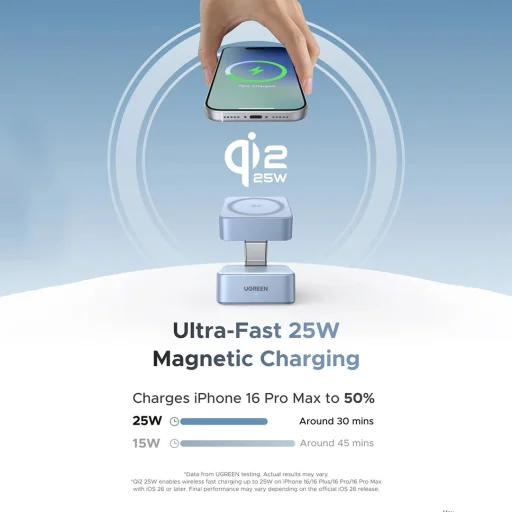 - 25W Qi2 mágneses vezeték nélküli töltés: A legújabb Qi2 mágneses protokoll szerint tanúsított, és akár 25W-os gyors töltést biztosít a kompatibilis eszközök számára, mint például az iPhone 16 Pro Max, melyet mindössze ~30 perc alatt 50%-ra tölt.