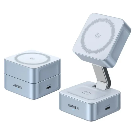 Töltsd eszközeidet okosabban és vezeték nélkül az UGREEN W752 2in1 vezeték nélküli töltővel! Ez az elegáns, kék színű, kettős eszközhöz tervezett töltőállomás támogatja a legújabb Qi2 szabványt, akár 25W-os szupergyors mágneses vezeték nélküli töltést biztosít, erős MagSafe-kompatibilis mágneses rögzítéssel, és egyszerre képes tölteni telefonodat és fülhallgatódat.