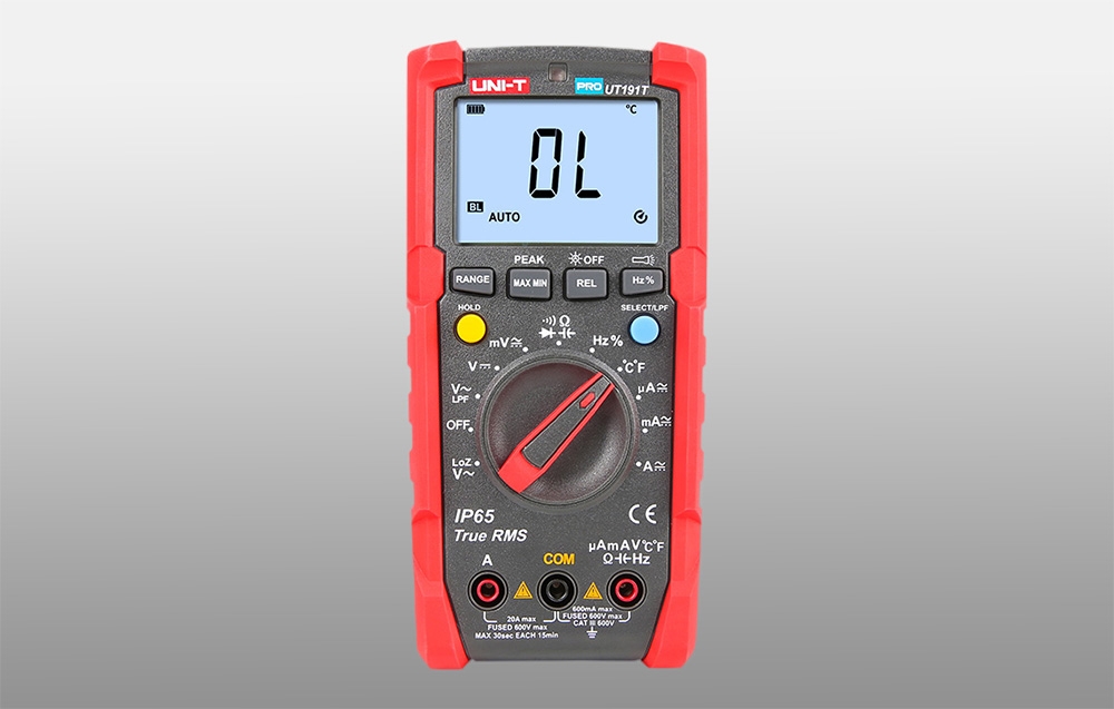Az UNI-T UT191T egy professzionális digitális multiméter, amelyet zord ipari környezetben való használatra terveztek. A True RMS funkcióval felszerelt mérőműszer pontos feszültség-, áram-, ellenállás-, kapacitás-, frekvencia- és hőmérséklet-méréseket biztosít. Az UT191T 6000-es felbontást és automatikus vagy kézi tartományválasztást kínál. A mérő háza megfelel az IP65 szabványnak, és akár 2 méteres magasságból történő leejtést is kibír, így ideális eszköz a zord és változó körülmények között történő használatra.