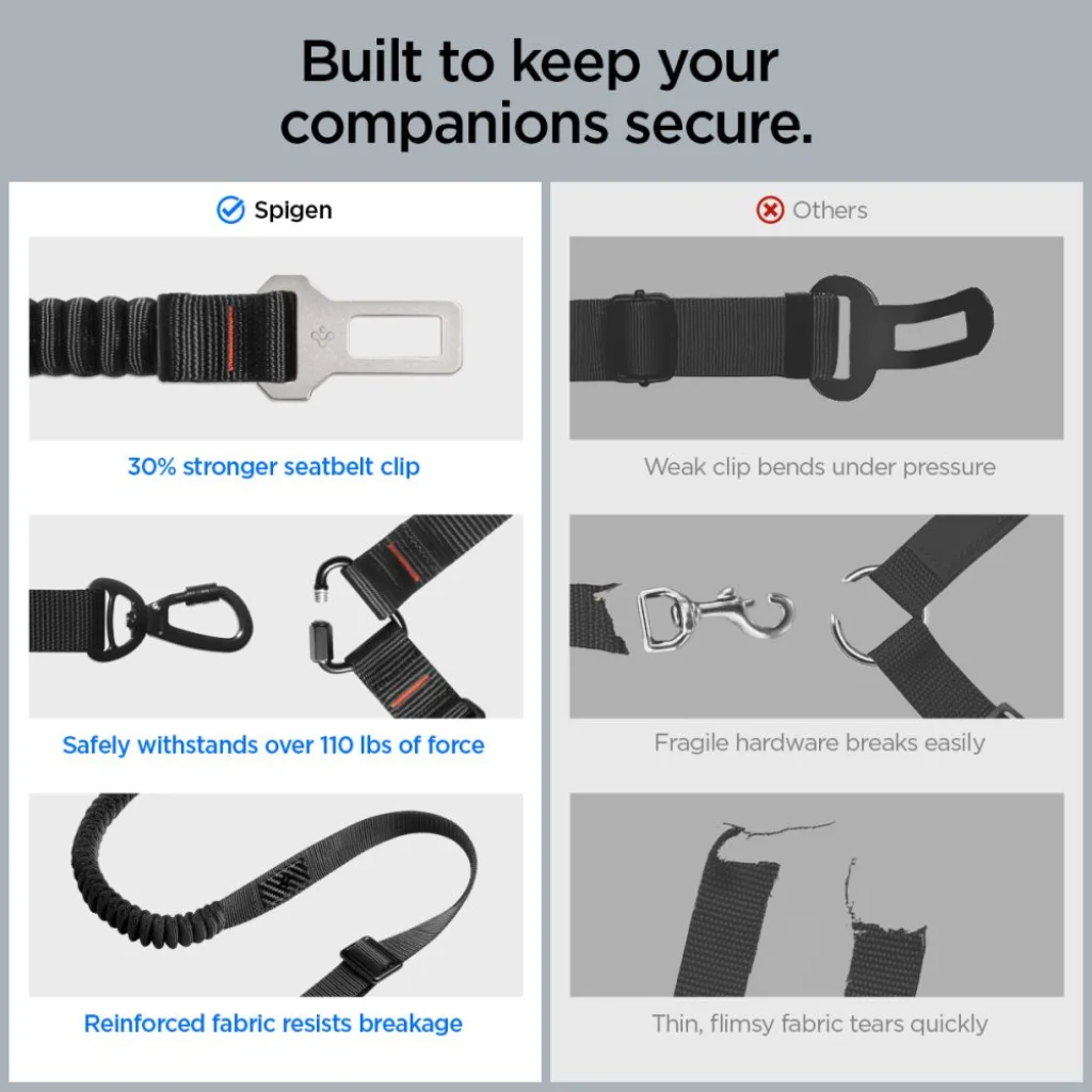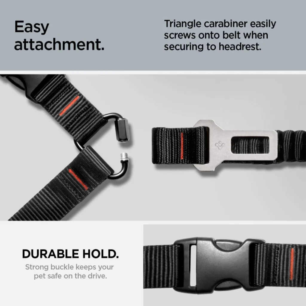A Spigen PS100 egy univerzális biztonsági öv háziállatok számára, amely autós utazások során kényelmet és biztonságot nyújt kedvencének. Tartós nylonból készült karbon szálas kiegészítőkkel, amely ötvözi a tartósságot az elegáns dizájnnal, hosszú távú használatot biztosít még intenzív utazások során is. Az öv rugalmas szakasza 97 cm-től 137 cm-ig terjed, biztosítva a széles mozgásteret és a kényelmes fekvést vezetés közben. A 360°-ban forgatható karabiner lehetővé teszi a szabad mozgást anélkül, hogy összegabalyodna a póráz, ezzel növelve az utazási kényelmet és csökkentve a stresszt mind az állat, mind a sofőr részéről. A multifunkcionális kialakítás két rögzítési módszert kínál: az autó biztonsági övébe csatolható vagy az ülés fejtámlája köré köthető. Mindkét megoldás hatékonyan korlátozza az állat szabad mozgását az autóban, minimalizálva a sofőr figyelemelterelését és növelve a vezetés biztonságát. A rögzítő rendszer egyszerű és intuitív, nem igényel további eszközöket vagy bonyolult telepítést. Az öv univerzális és a legtöbb járműhöz illeszkedik, amely ideálissá teszi bármilyen autómodell esetén. Könnyű kialakítása nem terheli az állatot, a tartós anyagok pedig megbízhatóságot biztosítanak hosszú távon. A Spigen Pet Car Seatbelt révén minden utazás biztonságosabbá és kényelmesebbé válik kedvencével.