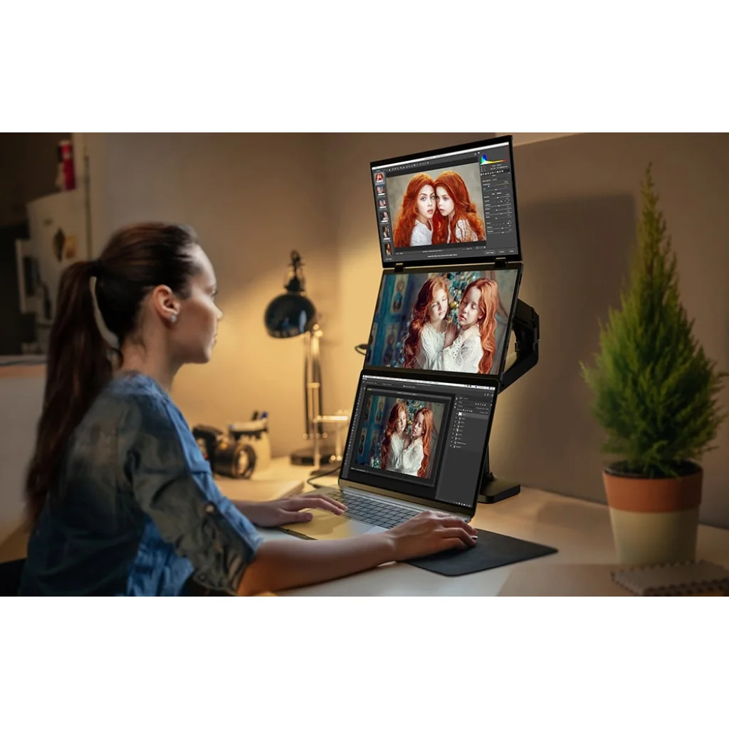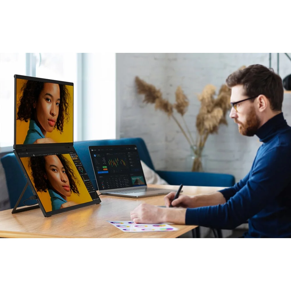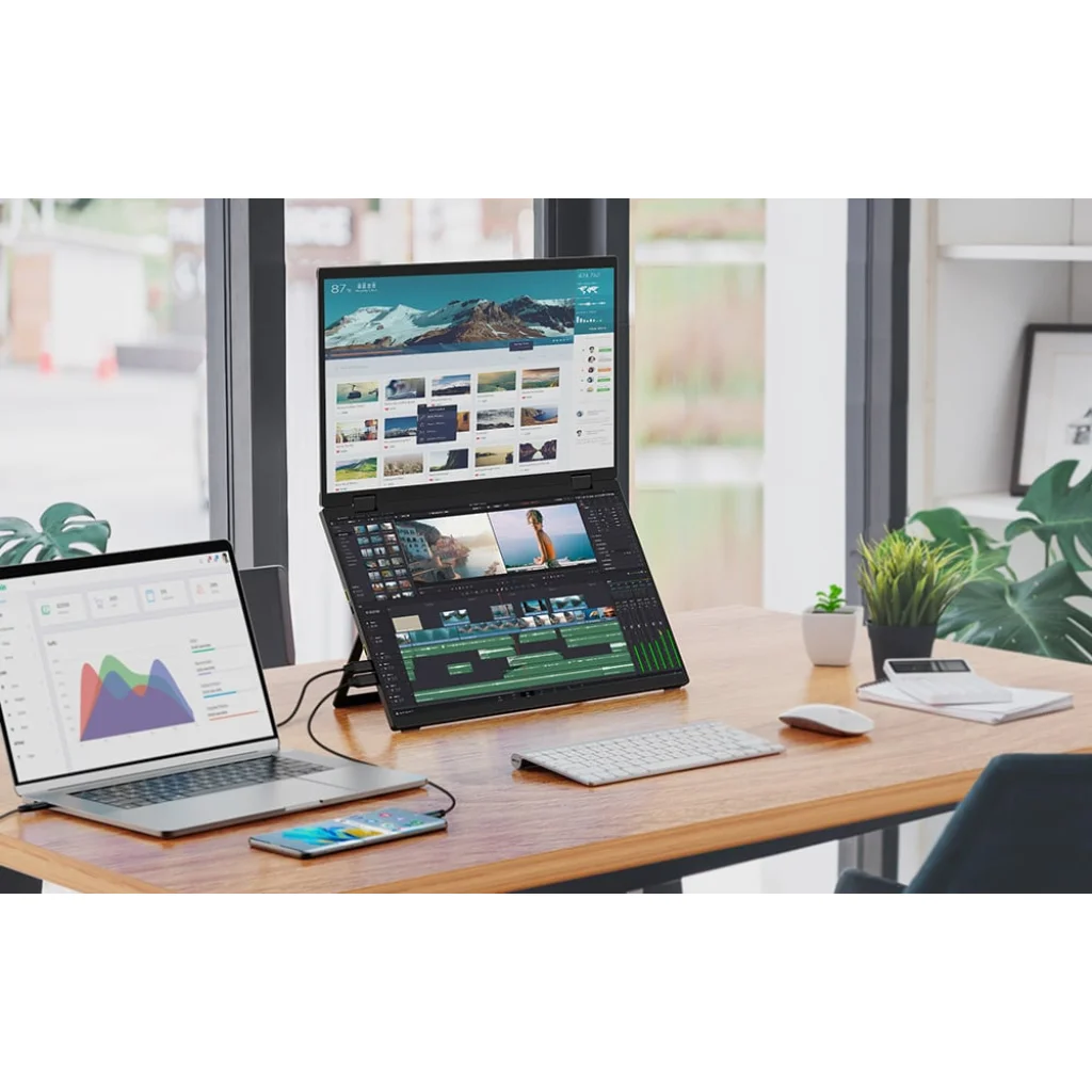 Az Uperfect Delta kettős képernyővel rendelkezik, amelyek pozíciója állítható, csökkentve a szem- és nyakfáradtságot. Az összecsukható kialakítás lehetővé teszi a képernyők különböző szögekbe állítását, ami ideális prezentációkhoz, online megbeszélésekhez vagy több feladat egyidejű végzéséhez. A két képernyő együtt vagy egymástól függetlenül működhet, így rugalmasabban és hatékonyabban használhatja a munkahelyét. Ez lehetővé teszi, hogy teljesen a munkájára koncentráljon, minimalizálva az ablakok közötti görgetés és váltás során eltöltött időt.