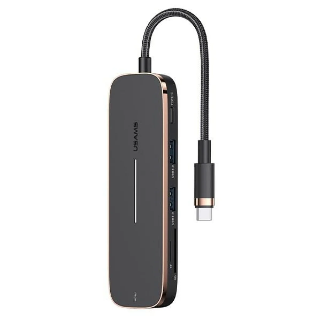 USAMS Multifunkcionális 6-az-1-ben Type-C adapter 2USB, 1USB-C, 1HDMI, Micro SD és SD kártyaolvasóval. A 6-az-1-ben csatlakozó kombináció széles körű alkalmazást biztosít, lehetővé téve, hogy hat különböző eszközt használjon egy porton keresztül egyszerre. Minden csatlakozó egy eszközbe van beépítve. Az adapter beépített USB-C kábellel rendelkezik, amely gyors töltést, valamint gyors és stabil USB3.02 450MB/s adatátvitelt biztosít. Gyors adatátvitellel egy 1GB fájlt csupán 3 másodperc alatt küldhet el. Az HDMI bemenet 4K 30Hz minőségű képátvitelt biztosít, lehetővé téve, hogy eszközét TV-hez csatlakoztassa, és saját házimozit hozzon létre. Az adapter beépített LED jelzőfénnyel rendelkezik, enyhe fehér fénnyel. Könnyen használható adapter, nem igényel további illesztőprogramokat, csak csatlakoztassa és használja. Termék jellemzői: - HDMI 4K 30Hz - USB3.02 450MB/s - TF/SD 60 MB/s - HDMI 4K 30Hz.