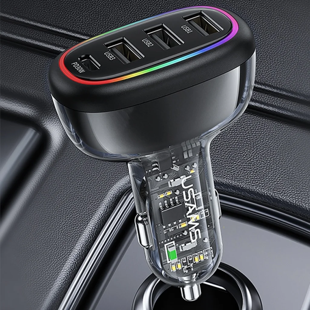 Az USAMS US-CC170 autós töltő kiemelkedő jellemzője a beépített meleg RGB LED világítás, amely sötétedéskor automatikusan aktiválódik. Ez a lágy és kellemes fény nem csak esztétikus, hanem rendkívül praktikus is éjszakai vezetés közben, mivel nem zavarja meg, és nem vakít, hanem elegáns hangulatot teremt az utastérben. A vizuális élményt a termék átlátszó házán keresztül látható, aprólékosan kidolgozott áramköri lap teszi teljessé, mely a modern technológia iránti vonzódásunkat hivatott kielégíteni.