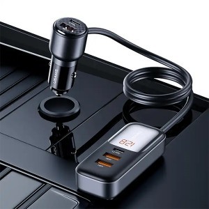 A USAMS C40 autós töltő öt különálló porttal rendelkezik, így egyszerre több eszközt is tölthetsz. A rendszer két fő részből áll: a szivargyújtóba illeszkedő fő egység, amely egy USB-A és egy USB-C portot kínál, valamint egy 150 cm-es kábellel csatlakozó, elegáns kiegészítő egység. Ez az extra sáv további két USB-A és egy USB-C portot tartalmaz, lehetővé téve, hogy az utastér különböző pontjain ülők is könnyedén tölthessék eszközeiket – legyen szó a hátsó ülésen utazó gyerekekről, vagy az első ülésen ülő utasról. Az extended egység egy jól olvasható LED kijelzővel is fel van szerelve, amely valós időben mutatja az aktuális feszültséget, így mindig tájékozott lehetsz a töltési folyamatról. A fő töltőegység mérete 66 x 27 x 27 mm, míg a kábellel ellátott sáv 82 x 24 x 34 mm, így kompakt méretük ellenére is maximális funkcionalitást nyújtanak.