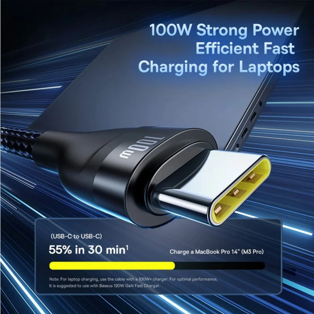 - Laptopokhoz optimalizálva: Az USB-C kimenetek 100W-os kapacitása révén könnyedén töltheti laptopját is. Például egy MacBook Pro 14" (M3 Pro) akkumulátorát 30 perc alatt 55%-ra töltheti fel (USB-C-ről USB-C-re történő csatlakoztatással). Az optimális teljesítmény érdekében 100W+ teljesítményű, lehetőleg Baseus 120W GaN Fast Charger hálózati adapter használata javasolt.