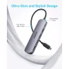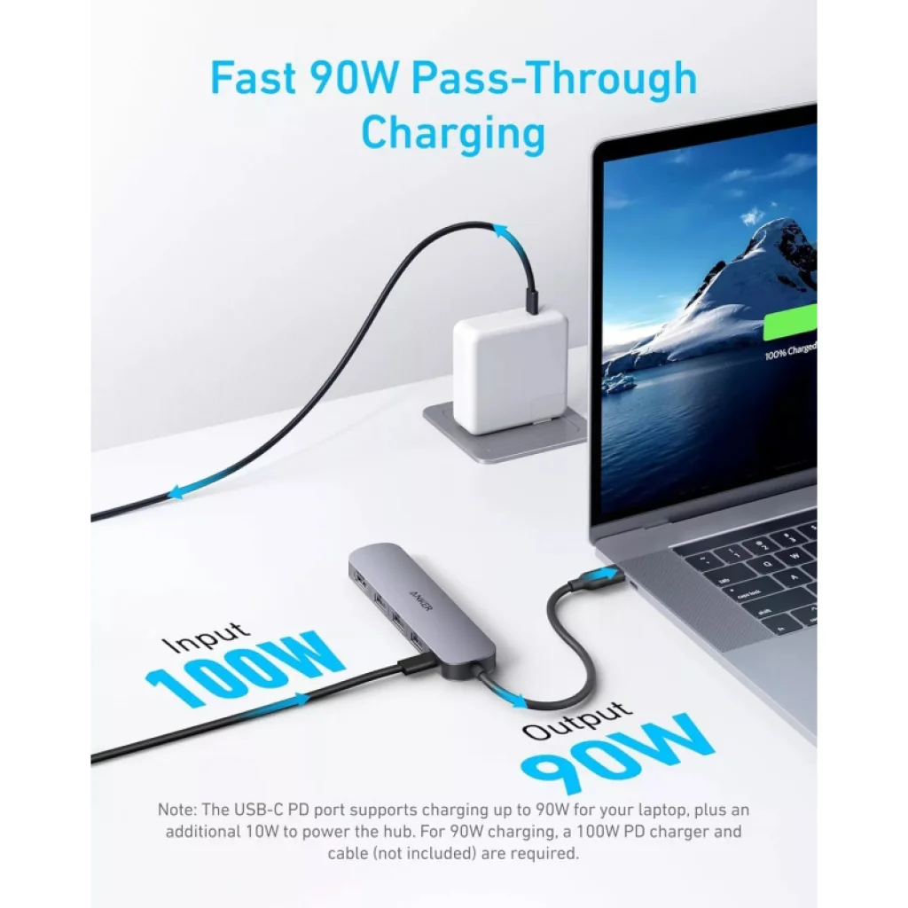 Az Anker 5 az 1-ben USB-C Hub teljes körű csatlakoztathatóságot biztosít, és multifunkcionális központként szolgál a laptopod számára. USB-C Power Delivery bemenettel, két USB-A 2.0 porttal, egy USB-A 3.0 porttal és egy HDMI porttal rendelkezik, így több eszközt is csatlakoztathatsz egyszerre. Az USB-C PD-IN port kizárólag laptop töltésére szolgál, és nem képes perifériák ellátására. A hub támogatja a 90W-os átmenő töltést a teljes 100W bemenetből, 10W-ot fenntartva a saját működésére (fali töltő nem tartozék). A USB 3.0 port gyors adatátvitelt biztosít akár 5 Gbps sebességgel, míg a két USB 2.0 port 480 Mbps sebességgel működik, növelve a produktivitást és a perifériák csatlakoztathatóságát. A HDMI port lehetővé teszi a csatlakozást egy külső monitorhoz 4K felbontásban 30Hz-en, tükör vagy kiterjesztett módban. Kompatibilis MacBook (macOS 12+), Windows 10/11, ChromeOS rendszerrel, és DP Alt Mode és Power Delivery támogatással rendelkező laptopokkal (nem kompatibilis a Linuxszal).