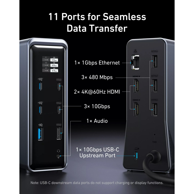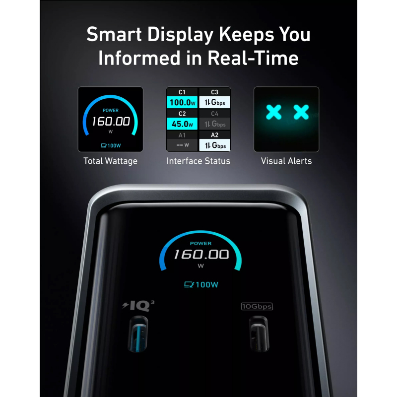 Az intuitív beépített kijelző képernyő valós idejű információkat mutat a hub működéséről. Monitorozhatod az összesített teljesítményfelvételt, az egyes portok (C1, C2, C3, C4, A1, A2) töltési állapotát és adatátviteli sebességét (pl. 100W 10Gbps, 45W 10Gbps), valamint fontos vizuális figyelmeztetéseket is megjelenít, hogy eszközeid optimálisan működjenek.