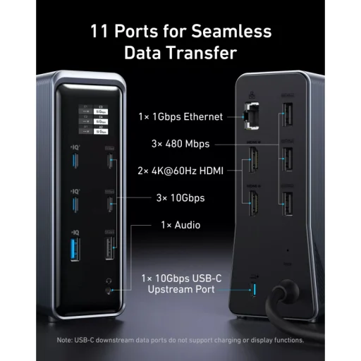 Élvezd a 10Gbps adatátviteli sebességet a kompatibilis portokon keresztül, a gyors fájlmozgatás céljából az eszközök között. A hub támogatja a dupla 4K kijelzőket 60Hz-en, élénk színeket és éles részleteket kínálva. Fontos megjegyezni, hogy míg Windows rendszereken akár három független kijelző (laptop + két külső monitor) is konfigurálható, macOS esetén a külső kijelzők kiterjesztési lehetőségei korlátozottabbak lehetnek, különösen a három független kijelzős konfigurációk tekintetében.