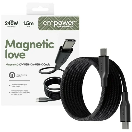 Az Empower by PanzerGlass mágneses kábel ötvözi a teljesítményt, a megbízhatóságot és az elegáns dizájnt. USB Power Delivery 3.1 EPR támogatással akár 240W-ig, képes könnyedén ellátni még a legigényesebb eszközöket is, mint például laptopokat, táblagépeket és okostelefonokat. Tartós USB-C csatlakozók biztosítják a gyors és stabil töltést és hatékony adatátvitelt, míg az 1,5 méteres hosszúság kényelmet biztosít a mindennapi használathoz otthon, az irodában vagy útközben. A strapabíró konstrukció úgy lett kialakítva, hogy bírja a nagy igénybevételt, és a beépített mágneses rendező biztosítja, hogy a kábel mindig szépen elrendezve maradjon, és ne gabalyodjon össze a táskájában vagy az asztalán. Egy praktikus és modern megoldás azok számára, akik nagyra értékelik a kiváló minőséget, funkcionalitást és stílust. Az USB-C csatlakozók nem csak gyors és stabil töltést biztosítanak, hanem hatékony adatátvitelt is, így a kábel sokoldalú eszköz munkához és szórakozáshoz. Az 1,5 méteres hosszúság kényelmet biztosít a napi használathoz, legyen szó irodai, otthoni vagy utazási használatról. Műszaki adatok: Gyártó: PanzerGlass; Modell: Empower Mágneses USB-C ↔ USB-C; Maximális töltési teljesítmény: 240W (USB Power Delivery 3.1 EPR); Kábel hossza: 1,5 m; Szín: Fekete; További jellemzők: Mágneses rendező a könnyű tároláshoz; Kompatibilis: laptopok, okostelefonok, táblagépek és más USB-C eszközök; Cél: gyors töltés és adatátvitel.