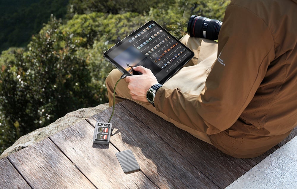 A négy memóriakártya számára beépített rekesznek köszönhetően nem kell többé külön tárolnia a hordozókat. A tokban 2 SD-kártya és 2 TF-kártya számára van hely, a mágneses fedél pedig megvédi őket a portól és a véletlen kicsúszástól. Ez praktikus megoldás azoknak, akik mobilak és gyakran dolgoznak terepen.