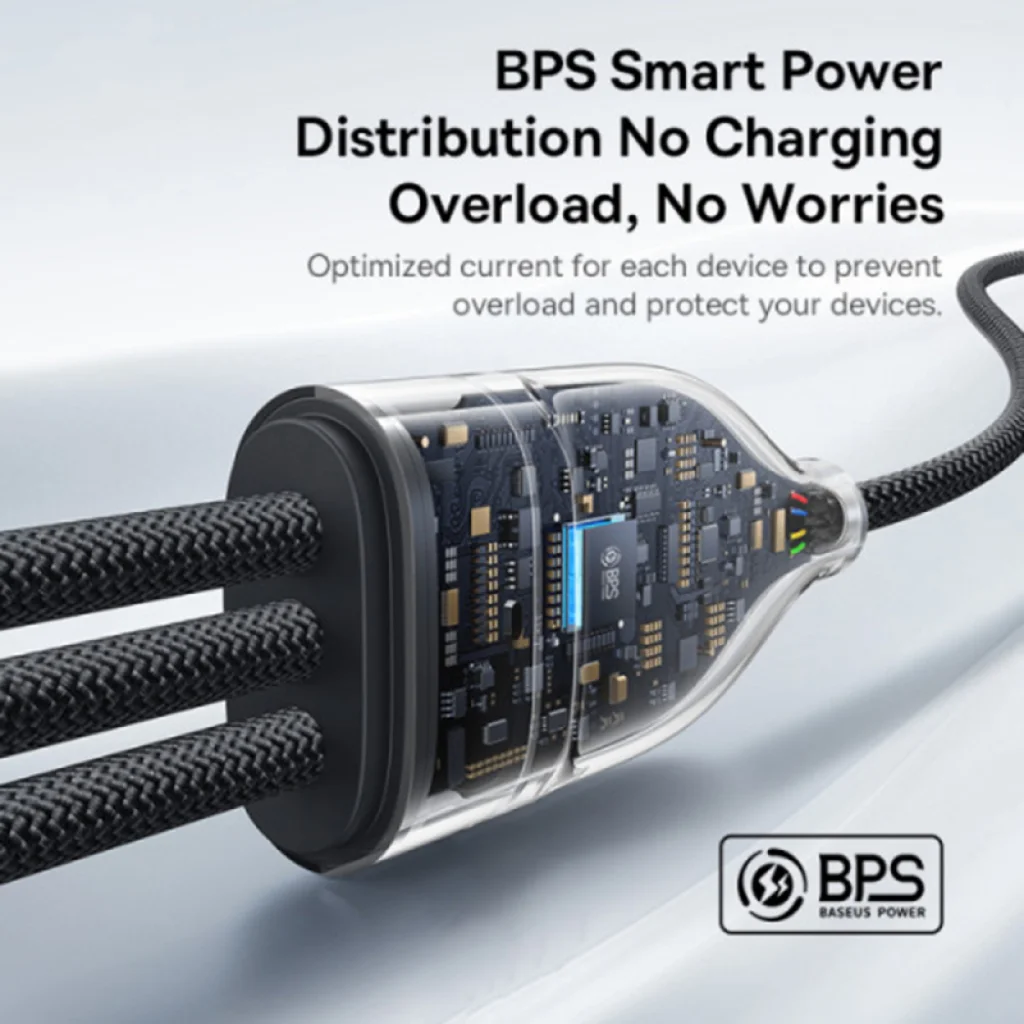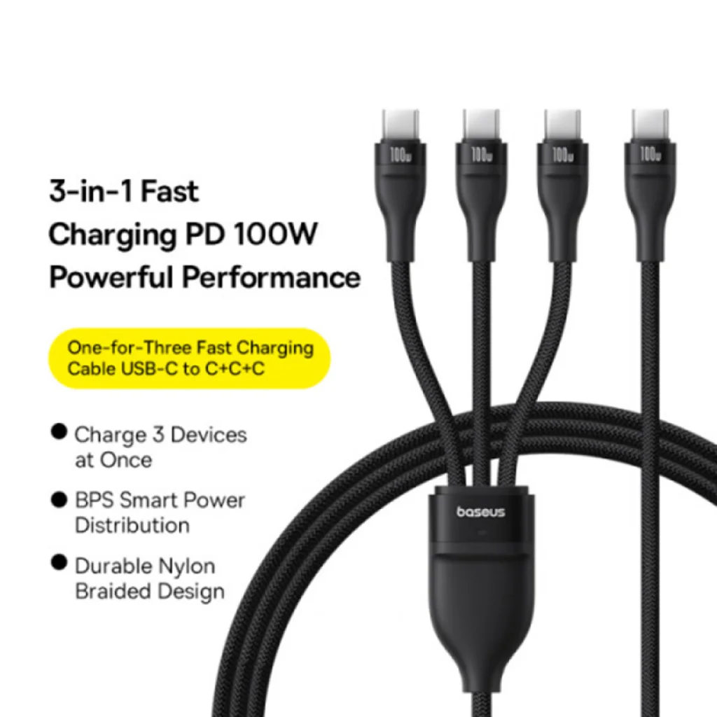 USB-C to 3 x USB-C Kábel Baseus Flash Series III 3in1 - Fekete. A Baseus Flash Series III az ideális kábel azok számára, akik egyetlen kiegészítőben keresnek nagy teljesítményt, sebességet és megbízhatóságot. Három USB-C csatlakozójával lehetővé teszi több eszköz egyidejű töltését, akár 100W-os Power Delivery-t biztosítva okostelefonok, tabletek és laptopok gyors és hatékony töltéséhez. Számos márkával kompatibilis, mint például iPhone, Samsung, Huawei, MacBook, Dell és mások, a kábel sokoldalú élményt kínál mindennapos töltéshez és professzionális használatra egyaránt. A 480 Mbps adatátviteli sebesség lehetővé teszi a fájlok és adatok gyors szinkronizálását. Prémium minőségű anyagokból készült, tartós nejlonfonattal, a kábel több mint 10.000 hajlítást áll ki, így hosszú élettartamot biztosít még nagy igénybevétel esetén is. A Baseus BPS technológia intelligens védelemmel van ellátva a túltöltés, túlfeszültség és túlmelegedés ellen, garantálva a stabil és biztonságos töltési folyamatot.