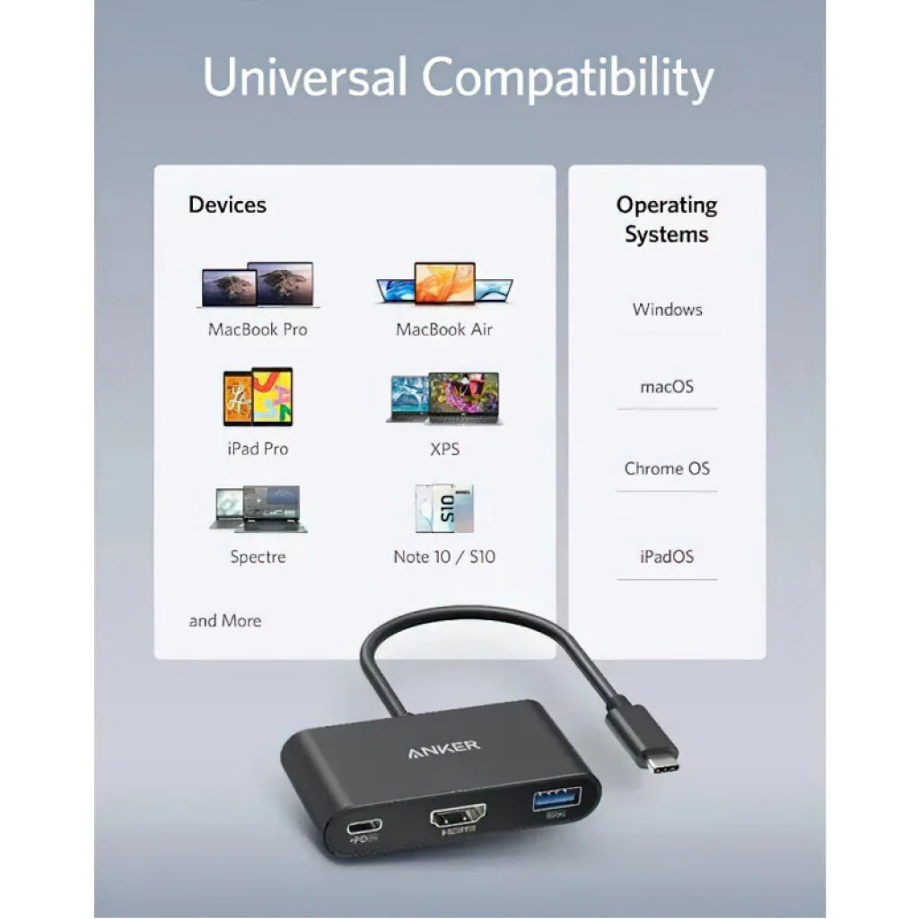 Fedezd fel az Anker PowerExpand USB-C 3 az 1-ben adapter sokoldalúságát, amely ideális megoldás arra, hogy egyetlen USB-C portot átalakítsunk egy HDMI porttá média megjelenítéshez, egy USB-A porttá a gyors fájlátvitelhez, és egy USB-C Power Delivery porttá az áthidaló töltéshez. Kompakt és elegáns, ez a hub lehetővé teszi, hogy kibővítsd laptopod vagy táblagéped funkcionalitását anélkül, hogy a mobilitást feláldoznád. Élvezd a 4K@30Hz média megjelenítést a HDMI porton keresztül, amely tökéletes prezentációkhoz, filmekhez vagy többfeladatos munkavégzéshez, miközben az USB-A port gondoskodik a fájlátvitelről akár 5 Gbps sebességgel. Ezenkívül, ha egy USB-C töltőt csatlakoztatsz a Power Delivery porthoz, töltheted az eszközöd, miközben a többi funkciót is használod. Az Anker PowerExpand kompatibilis számos modern eszközzel, például MacBook Pro, MacBook Air, iPad Pro, Dell XPS, Lenovo Yoga, HP Spectre X360, ThinkPad X1 és Microsoft Surface Pro 7, teljes körű, kompromisszummentes élményt nyújtva. Az USB-A port nem támogatja a töltést, és az adapter nem kompatibilis a Nintendo Switch és az Apple USB SuperDrive eszközökkel.