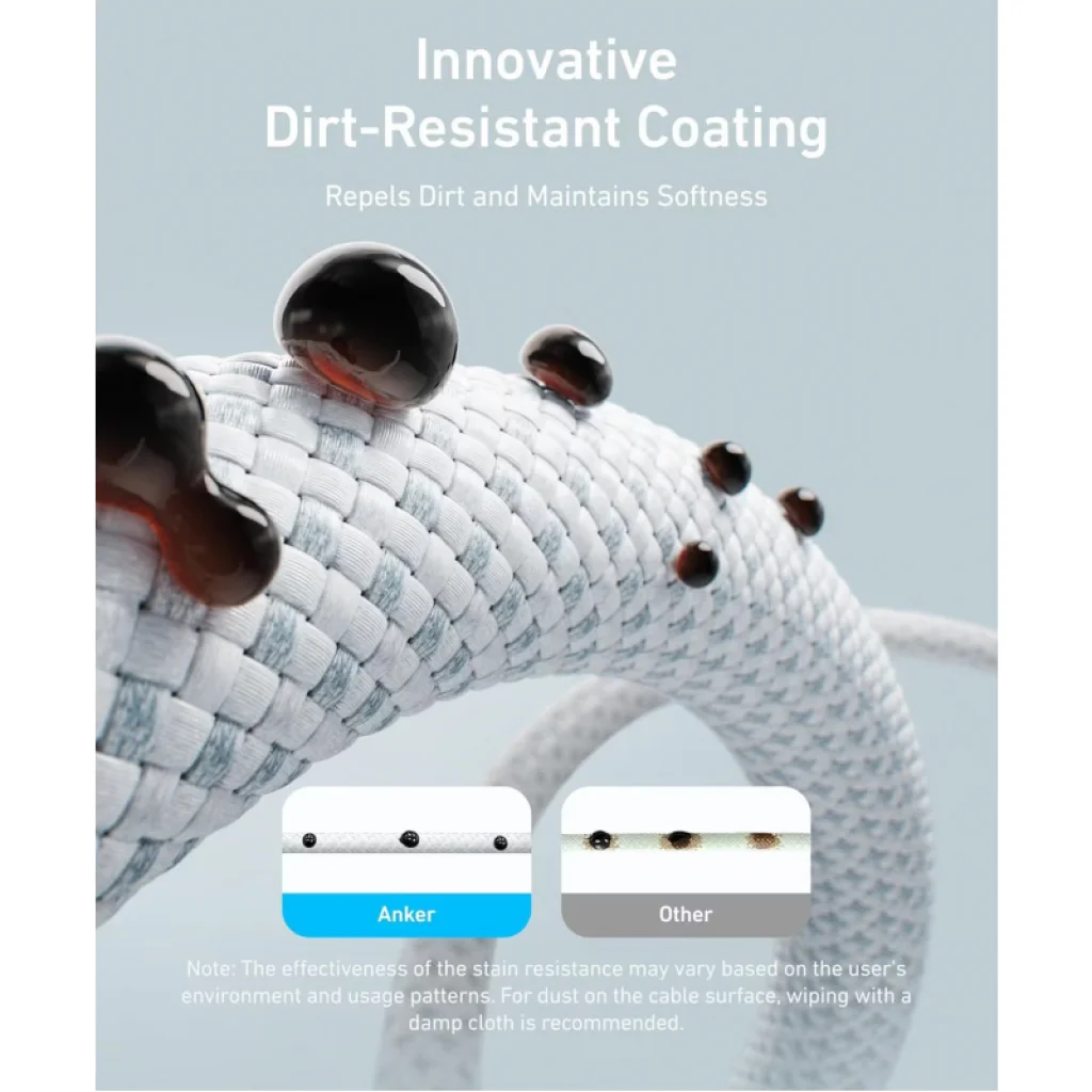 • Szennyeződésálló bevonat: Az innovatív, egyrészes szerkezet szennyeződésálló bevonattal van ellátva, amely taszítja a szennyeződéseket és megőrzi a kábel tisztaságát, puhaságát hosszú távon, minimalizálva az elhasználódás jeleit.